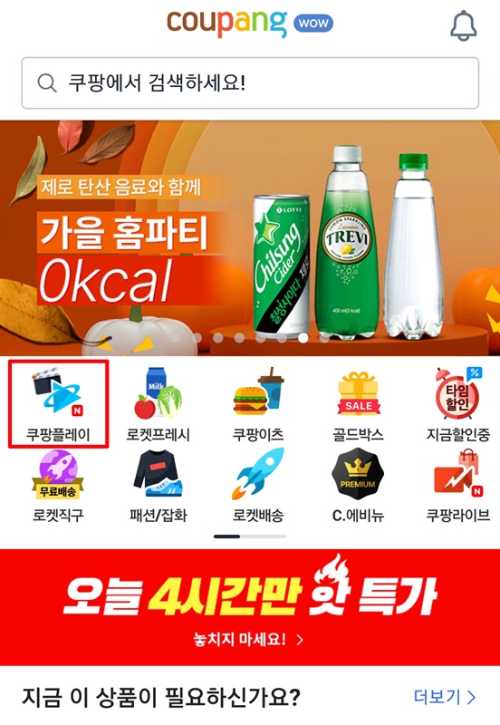 1. 우서 쿠팡 어플로 접속해 줍니다. 아래 사진처럼 쿠팡플레이를 클릭해 주세요.