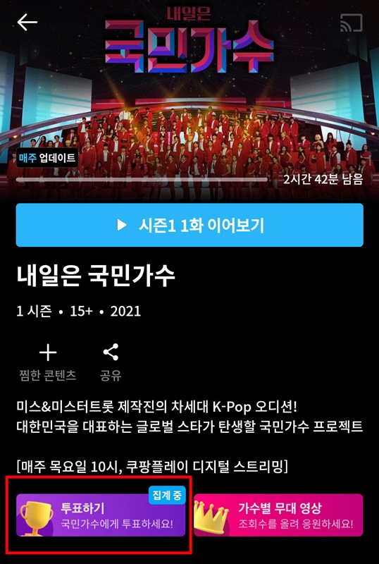내일은 국민가수가 3회 방송이 되었습니다. 화제가 되고 있는 내일은 국민가수 투표는 현재 쿠팡에서 하실 수 있는데 와우 회원이면 쿠팡 플레이를 다운받아서 한 번 더 투표를 하실 수 있습니다. 즉, 쿠팡에서 1번 투표, 쿠팡플레이에서 1번 투표 총 2번 투표를 하실 수 있으니 아래에서 다운받아서 투표하시기 바랍니다.