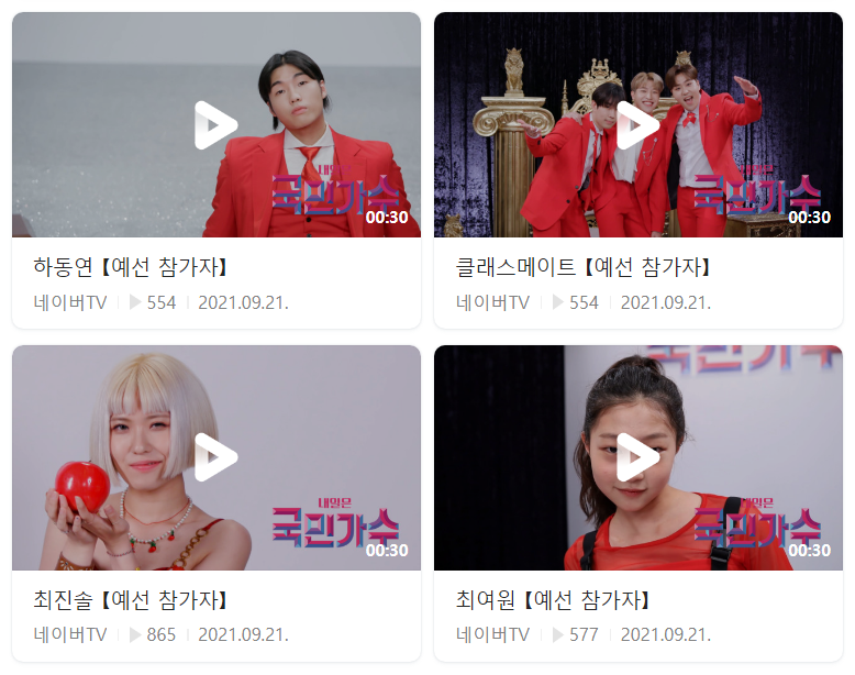 배달앱 라이더부터 의사, 소방관, 노라조의 이혁까지 다양한 분야에서 지원을 했고 이렇게 다양한 분야에 실력이 쟁쟁한 분들이 숨어 있었다는 것을 실감했는데요. 내일은 국민가수 홈페이지로 들어가시면 예선 참가자들의 프로필을 하나 하나 볼 수 있습니다.